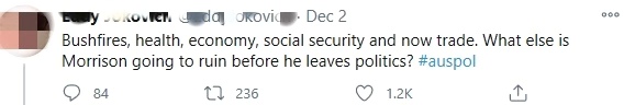 推特簡介為“新政治”播客聯合主持人、《意見分歧》合著者的艾迪·喬克維什在該話題下留言,羅列了澳總理上任以來的負面破壞,“森林火災、民眾健康、國家經濟、社會保障,現在是貿易關係。在莫里森離開政界之前,他還會毀掉什麼?” 有澳網友在這條推文下留言稱,如果還有什麼東西沒有被毀,毫無疑問他(莫里森)都能找出來。