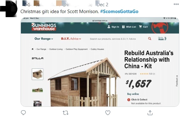 也有網友表示,希望莫里森為澳大利亞送一份聖誕節禮物,那就是“重建對華關係”,並配了一張發貨,標註着最好在14天到21天內送到。(海外網 張琪)