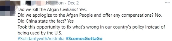 一位澳大利亞網友還發出三連問:“是我們殺了阿富汗平民嗎?是的。我們向阿富汗人道歉並提供任何補償了嗎?沒有。中方陳述的是事實嗎?是的。我們應該藉此機會來修正國家政策上的錯誤,而不是被美國利用。”