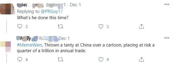 一位墨爾本網友提到,“總理讓澳大利亞再次陷入尷尬,‘莫里森該下台了’標籤又登上了熱搜榜。”評論區有人提醒稱,上一次是去年的12月1日,莫里森不顧國內森林大火肆虐,飛去夏威夷度假了。另有網友問,那他這一次做什麼了?墨爾本網友回答稱,就一幅漫畫向中國投擲了一枚重磅炸彈,使2500億美元的年貿易額處於危險之中。