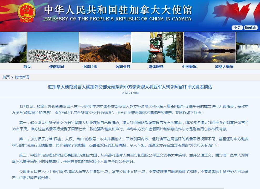 據中國駐加拿大使館網站12月4日消息,12月3日,加拿大外長新聞發言人在一份聲明中對中國外交部發言人趙立堅涉澳大利亞軍人屠殺阿富汗無辜平民的推文進行無端指責,妄稱中方發佈“虛假圖片和信息”、有關作法不符合所謂“外交行為標準”。中方對此表示強烈不滿和嚴厲譴責。我願作如下回應: