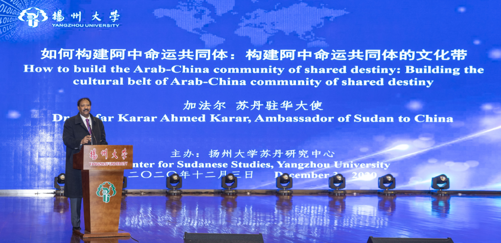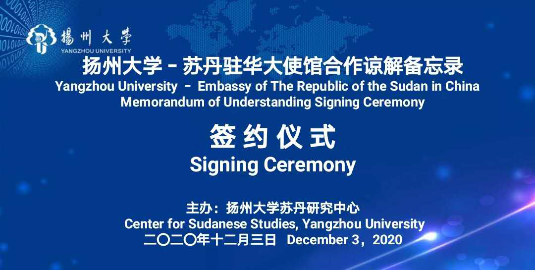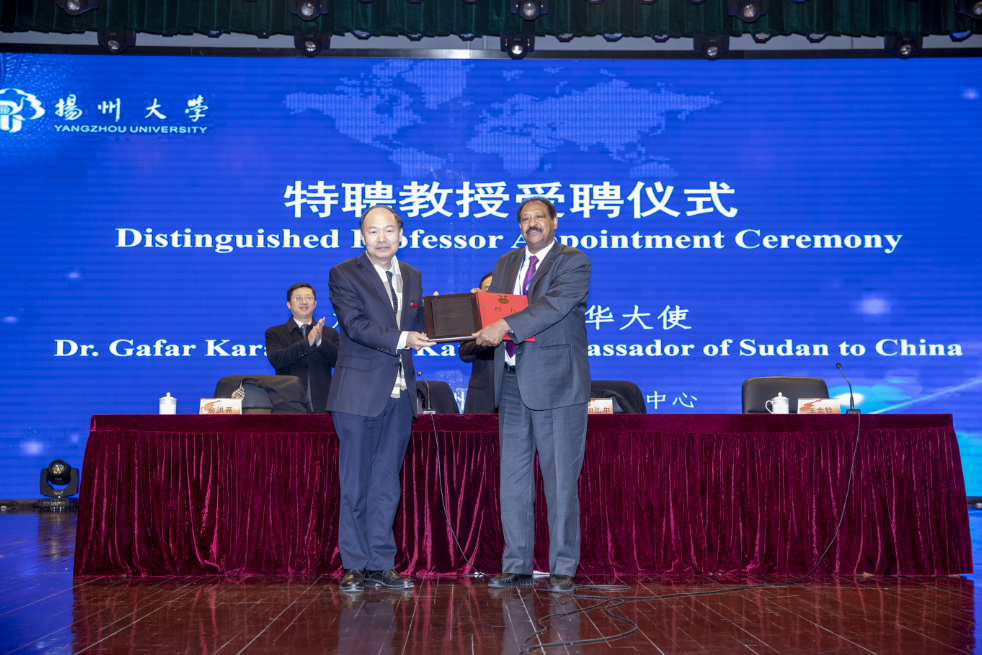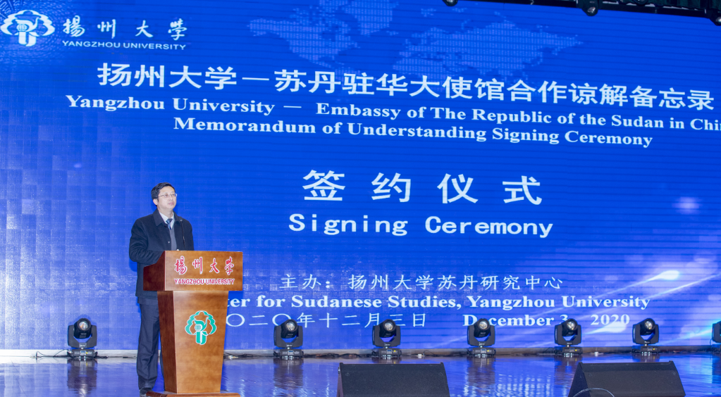 【環球網報道】揚州大學與蘇丹駐華大使館合作諒解備忘錄簽約儀式暨加法爾大使特聘教授受聘儀式12月3日在揚州大學舉行。揚州大學校長焦新安在簽約儀式上發表致詞。揚州大學副校長俞洪亮與蘇丹駐華大使加法爾分別代表揚州大學和蘇丹駐華大使館,在雙方合作諒解備忘錄上簽字。焦新安代表揚州大學蘇丹研究中心向加法爾頒發了特聘教授證書。加法爾向揚州大學師生作了題為《如何構建阿中命運共同體:構建阿中命運共同體的文化帶》的主旨報告,並現場回答了相關問題。揚州大學蘇丹研究中心執行主任王金銓主持了簽約儀式和主旨報告。