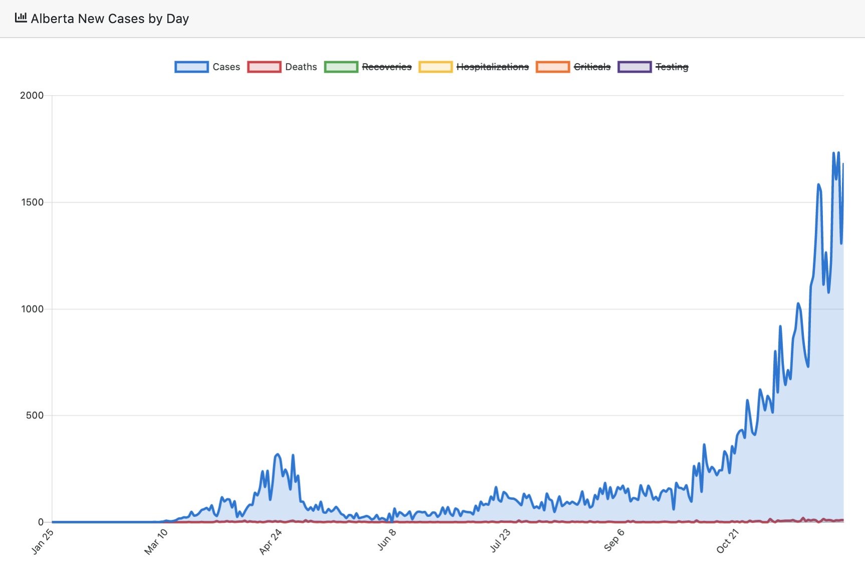 首先,艾伯塔省的疫情在11月初就已經出現了明顯加速的信號。事實上,在10月20日前後,該省每日新增的確診病例還只有不足200例,到了11月5日就已經暴增至800例。