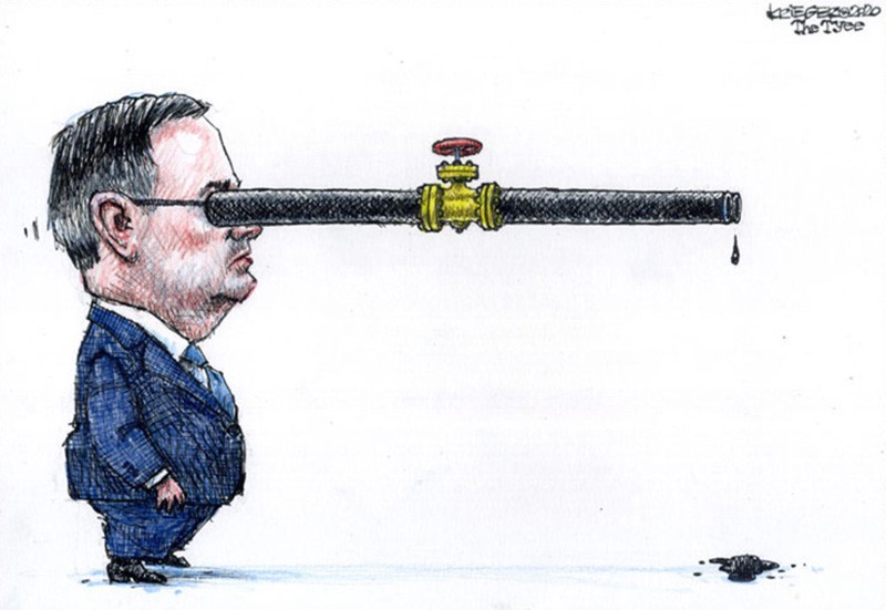 △漫畫作家克里格(Bob Krieger)諷刺艾伯塔省省長肯尼只看到石油工業利益的執政思想