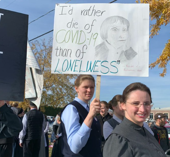11月9日,安大略省一個城鎮爆發反對抗疫措施的示威活動,標語牌上的文字是“寧死於新冠 不死於孤獨”。