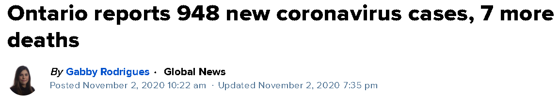△11月2日,環球新聞報道安大略省當日新增新冠確診病例948例,死亡7例