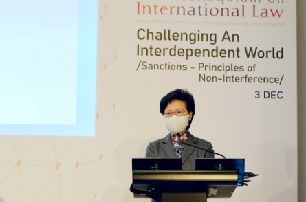 本次論壇由亞洲國際法律研究院(AAIL)和中國國際法學會(CSIL)合辦,主題為“制裁:對相互依存的世界的挑戰”,來自內地、香港及其他國家和地區的法律、金融、學術界人士以及外國駐港領館人員約400人蔘會。香港特區行政長官林鄭月娥女士、律政司長鄭若驊資深大律師、AAIL主席梁定邦資深大律師、CSIL會長黃進教授等在開幕式致辭。海牙國際法研究院秘書長Jean-Marc THOUVENIN教授、中國外交學院易顯河教授、中國政法大學國際法學院院長孔慶江教授、Davis Polk & Wardwell律師事務所合夥人Martin ROGERS先生、香港中文大學Chin Leng LIM教授等圍繞制裁問題進行了主題研討和問答。