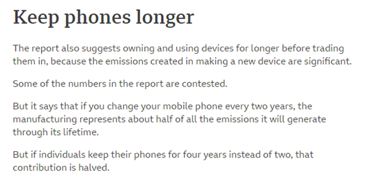 另外,這份報告還提出,人們如果能把目前2年更換一次手機的習慣,改為4年換一次,這也將為節能減排做出貢獻。因為這將減少電子產品生產時排除的温室氣體。