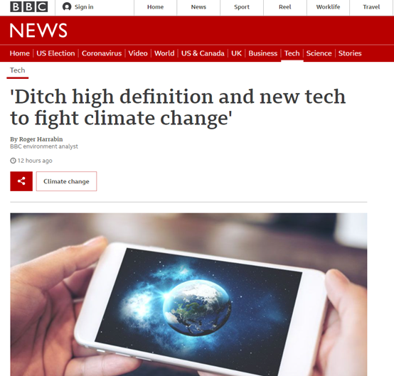 如下圖所示,在這篇名為“為了應對氣候變化,摒棄高清和高科技吧”的報道中,BBC表示英國一項研究發現,人們在觀看網絡視頻時如果選擇“高清”模式,這將產生8倍於“標清”模式的碳排放。