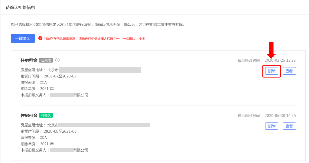 注意 :如有“已失效”狀態的信息,則需先刪除之後才能點擊“一鍵確認”。