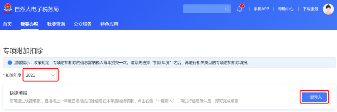 ① 如您 2020 年已填報過專項附加扣除信息,並需要在 2021年繼續享受,請及時關注相關信息是否發生變化(首頁【專項附加扣除填報】一【扣除年度】選擇“2021”一“快捷填報”欄【一鍵帶入】);如有變化,請及時修改。