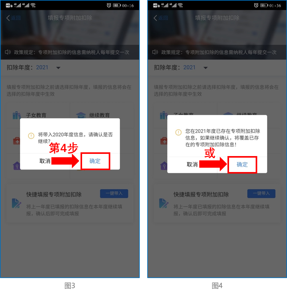 ② 依據提示“將帶入2020年度信息,請確認是否繼續?”或者“您在2021年度已存在專項附加扣除信息,如果繼續確認,將覆蓋已存在的專項附加扣除信息!”,確認後點擊“確定”;如下圖3、圖4: