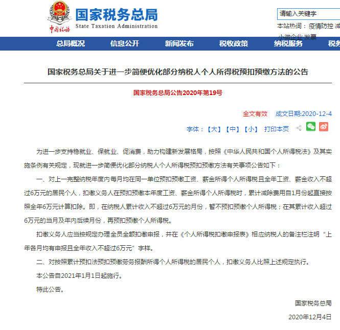 國家税務總局發佈關於進一步簡便優化部分納税人個人所得税預扣預繳方法的公告: