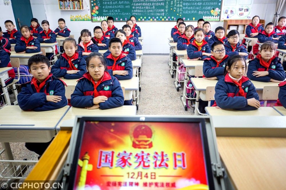 ↑2020年12月3日,浙江省湖州市德清縣武康街道東風小學學生在學習憲法。CICPHOTO/王正 攝