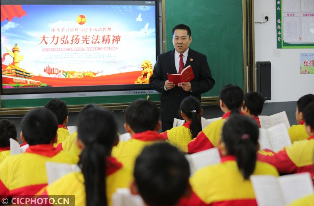 ↑12月1日,在山東省臨沂市沂南縣蘇村鎮中心小學,法官為學生講解憲法讀本。CICPHOTO/王彥冰 攝