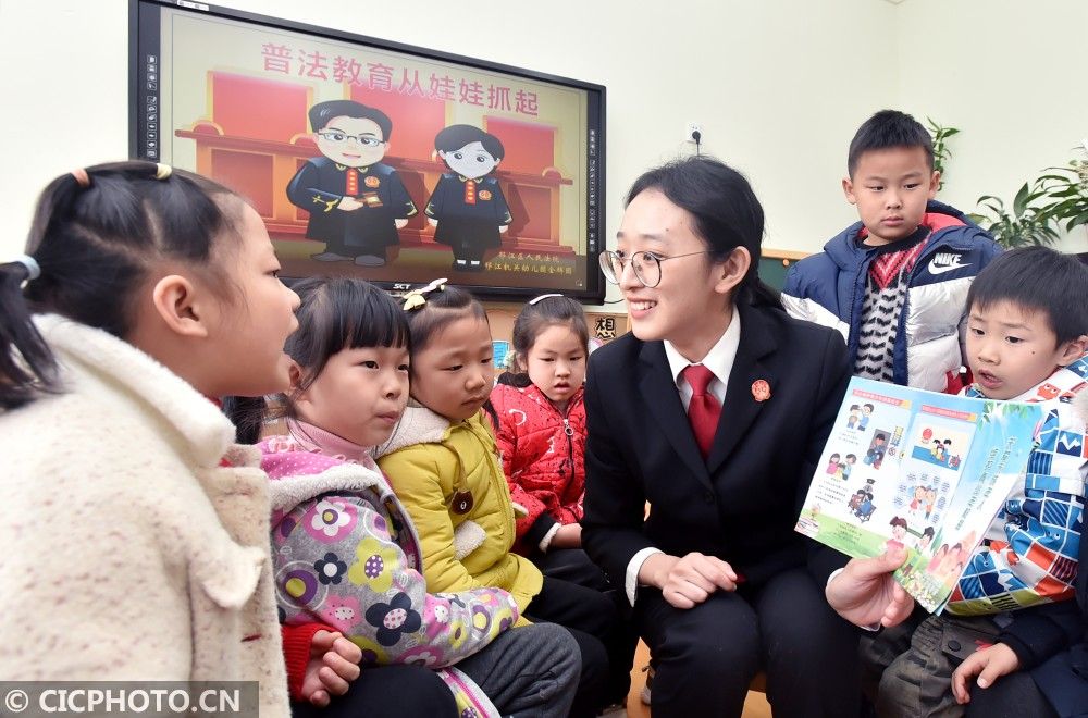 ↑2020年12月3日,江蘇省揚州市邗江區人民法院法官通過講故事的方式,向小朋友介紹基本自我保護常識。CICPHOTO/莊文斌 攝
