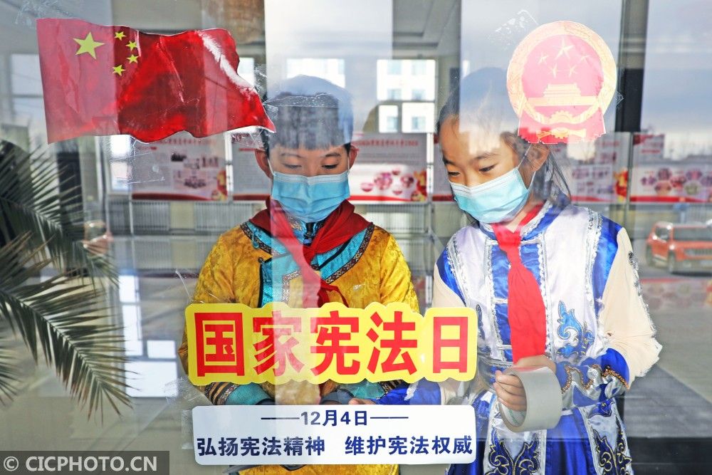 ↑2020年12月3日,內蒙古呼倫貝爾扎蘭屯市民族小學學生張貼國家憲法日宣傳海報。CICPHOTO/韓冷 攝