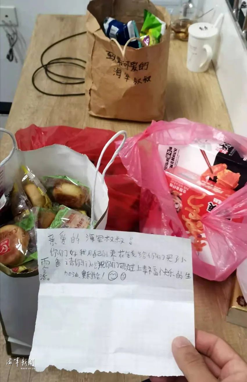 應該是第一次近距離靠近部隊營區,看着海軍叔叔在眼前,小女孩竟然一時間不知道説什麼,只是把幾袋零食遞給李啓勝。領會來意的李啓勝連忙拒絕:“不用了,不用了,小朋友自己拿回去吃吧!”