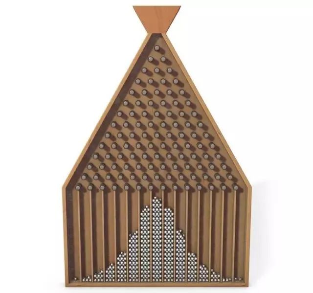 高爾頓板問題是由英國生物統計學家高爾頓提出來的,這個問題可以理解為小球從最上方被扔下,每經過一個釘板,都有一半的可能從左邊走,一半的可能從右邊走,當有很多個小球從上往下隨機掉落時,落在下面的格子裏的小球數量分佈上會呈現一定的統計規律,這個模型可以用來直觀地認識中心極限定理。