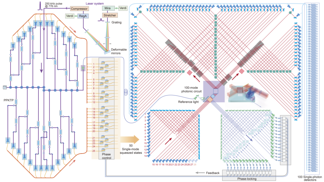 此次,潘建偉團隊通過自主研製同時具備高效率、高全同性、極高亮度和大規模擴展能力的量子光源,同時滿足相位穩定、全連通隨機矩陣、波包重合度優於99.5%、通過率優於98%的100模式干涉線路,相對光程10的負9次方以內的鎖相精度,高效率100通道超導納米線單光子探測器,成功構建了76個光子100個模式的高斯玻色取樣量子計算原型機“九章”,意為紀念中國古代最早的數學專著《九章算術》。