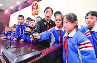 12月3日,在河北省邯鄲市叢台區人民法院,法官向叢台區十里鋪小學的學生介紹法庭相關設施。當日,十里鋪小學組織學生走進法院,通過開展模擬法庭等活動,瞭解法庭審理基本程序及涉及未成年人的相關法律知識,“零距離”感知法庭。郝羣英攝/光明圖片