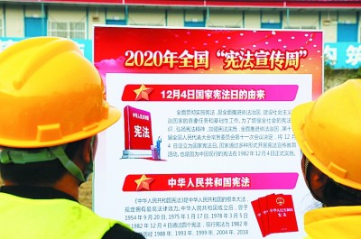 12月3日,工人在觀看憲法知識展板。當日,中鐵上海工程局聯合安徽省合肥市瑤海區人民法院在合肥暢通二環二標項目工地開展“送法進工地”活動,提高工地工人維護自身權益的能力。新華社發