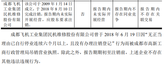 此外招股書披露,“成都飛機工業集團民機維修股份有限公司”在報告期內未實際開展經營,但是成都市高新工商行政管理局在2018年6月因“無正當理由已自行停業連續六個月以上,且沒有辦理註銷登記”行為,吊銷了該公司營業執照。這也指向在2018年之前,該公司並不處於“停業”狀態,而招股書所稱的“在報告期內未實際開展經營”真實性值得關注。