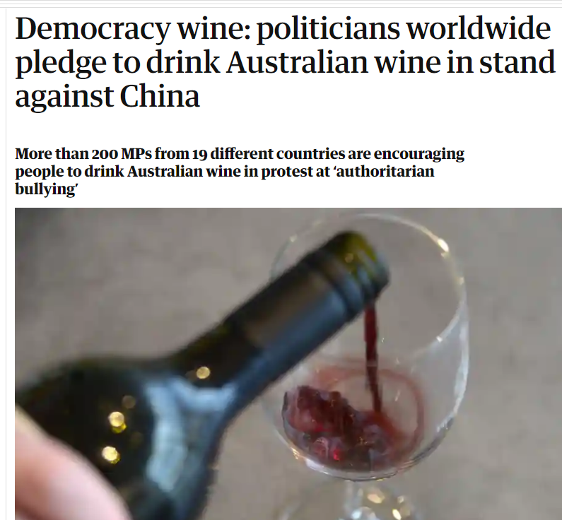 您還別説,一些來自澳大利亞和其他西方國家的反華政客,以及“港獨”“台獨”勢力的反華分子,還真給澳大利亞搞了一個相似的“市場拓展”策略。從英國《衞報》的報道來看,這些人正在呼籲所謂的“民主”國家都來支持澳大利亞,購買澳大利亞的紅酒等產品,並美其名曰這叫“民主的紅酒”。