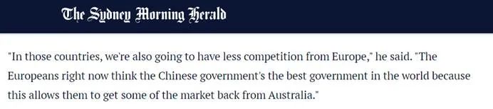 而即便是在《悉尼先驅晨報》那篇説澳大利亞紅酒商“不擔心失去中國市場”的報道中,也有一名澳大利亞葡萄酒商提到“此刻歐洲人一定認為中國政府是全世界最好的政府”,因為歐洲的酒商現在就可以把之前被澳大利亞佔據的中國市場給拿回來了。