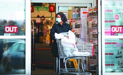 12月1日,在加拿大安大略省布蘭普頓,一名戴口罩的顧客推着購物車走出一家商店。