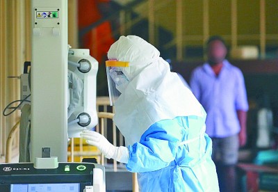 10月21日,醫務人員在科倫坡郊外的斯里蘭卡國家傳染病醫院內工作。新華社發
