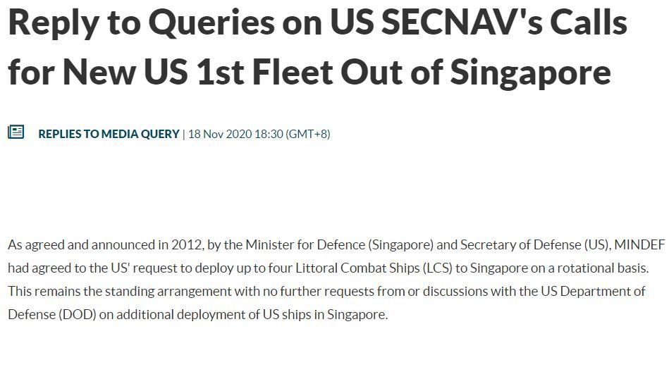 “依據2012年新加坡國防部長和美國國防部長達成的協議,新加坡防長同意美國在新加坡輪換部署至多4艘瀕海戰鬥艦的要求。這份協議至今有效,美國防部沒有提出在新加坡部署額外艦艇的要求,新加坡也沒有同美方進行相關討論。”