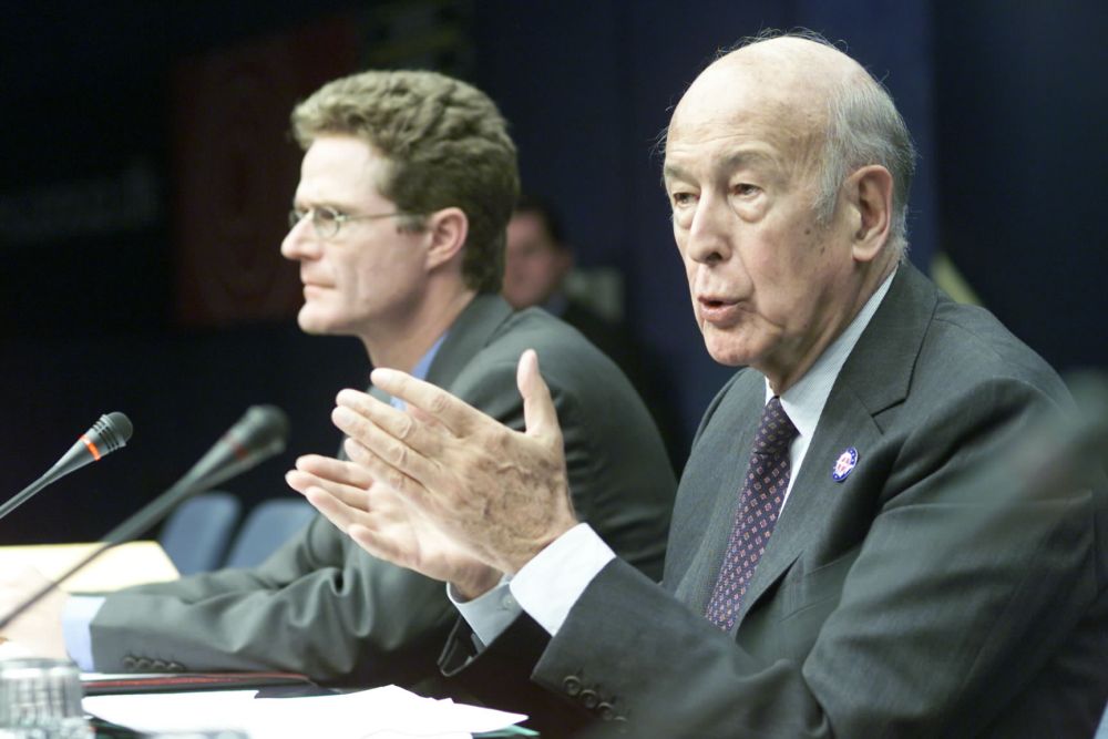 2002年10月24日,在比利時布魯塞爾,時任歐洲制憲委員會主席德斯坦舉行記者招待會,介紹歐洲發展藍圖。(新華社記者呂全成攝)