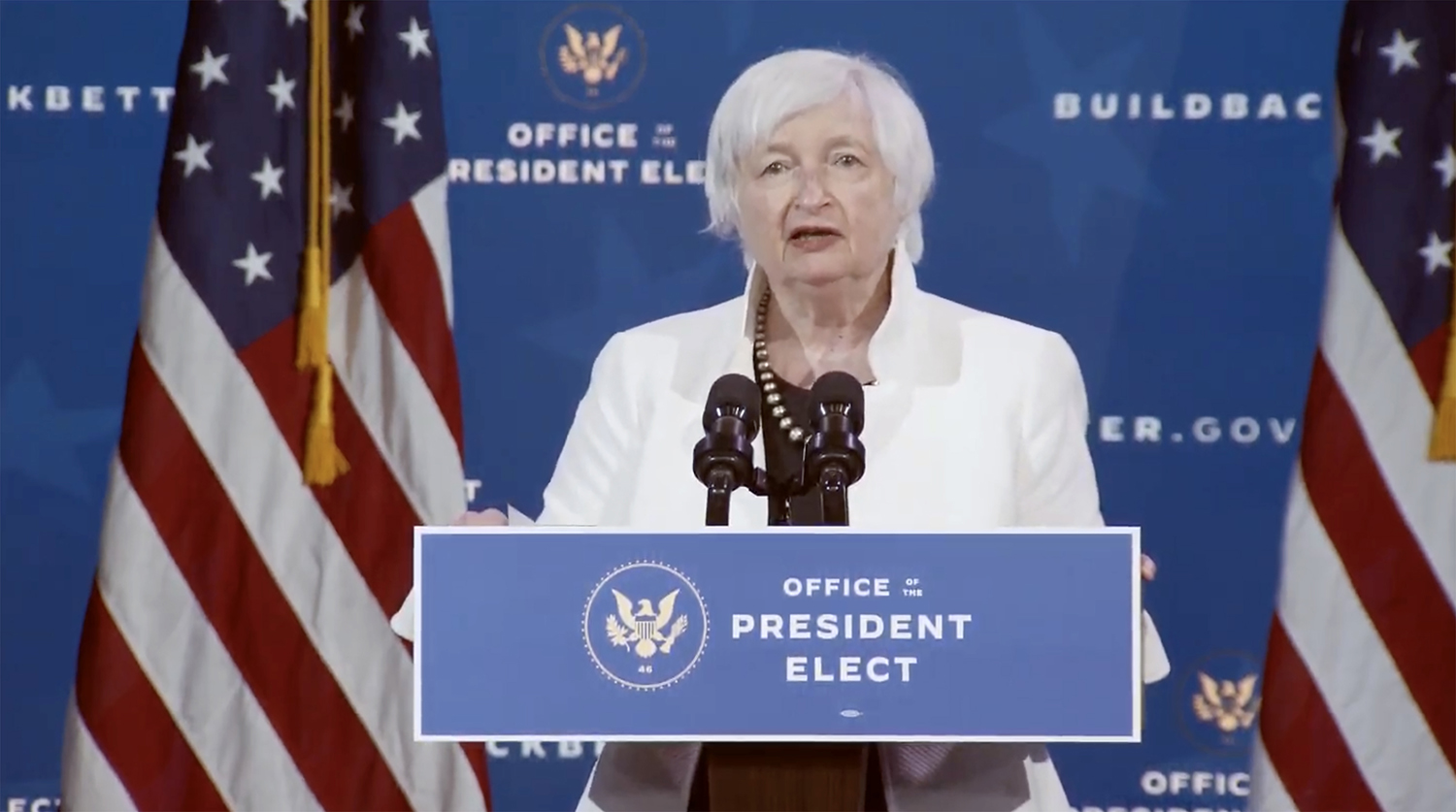當地時間2020年12月1日,美國特拉華州,珍妮特·耶倫發言。當日,美國當選總統拜登在特拉華州召開發佈會,攜其經濟團隊的主要成員亮相。 人民視覺 圖