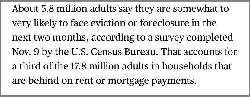 彭博社11月底的報道引用美國人口普查局的一項調查顯示,大約580萬成年人表示,他們在未來兩個月可能面臨被驅逐或喪失抵押品贖回權的情況。這在1780萬未付房租或抵押貸款的家庭中,佔了三分之一。