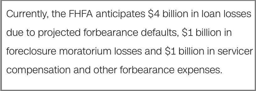 FHFA給出了詳細的預估數字:由於貸款延期、貸款違約等,損失為40億美元,止贖延期損失為10億美元,服務商補償和其他延期費用為10億美元。