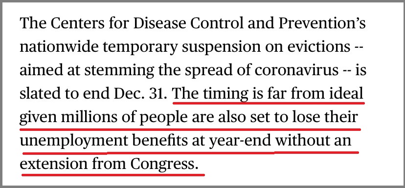此前,美國疾病控制和預防中心(Centers for Disease Control and Prevention)曾在全國範圍內暫停驅逐行動,旨在阻止新冠病毒的傳播,這一“暫緩驅逐令”定於12月31日結束。彭博社指出,“暫緩驅逐令”的中止還為時尚早,因為仍有數百萬人將在年底失去他們的失業救濟金。