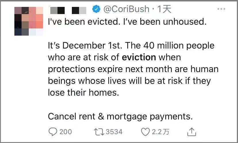 “我被驅逐了,我無家可歸。”這條僅發出半天就獲得2.2萬關注及3500多條轉發的推特寫道,“12月1日,四千萬人將被驅逐,失去住所的他們面臨生命危險。”寫下這篇推文的是一名國會議員,而她所説的“驅逐”,正成為美國媒體及社交平台上的熱詞被頻頻提及。