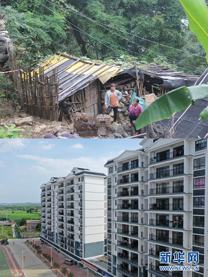 這是一張拼版照片,上圖為:2018年11月11日在廣西田東縣思林鎮龍邦村拍攝的村民和自家簡陋的房屋(思林鎮政府供圖);下圖為:2019年8月28日拍攝的當地為龍邦村新建的位於廣西田東縣思林鎮的易地扶貧搬遷安置點(無人機照片,新華社記者 曹禕銘 攝)。新華社發