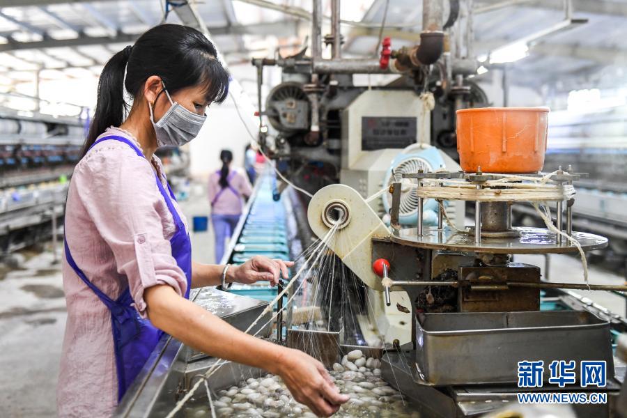 工人在廣西凌雲縣一家繅絲廠內煮繭抽絲(4月17日攝)。新華社記者 曹禕銘 攝