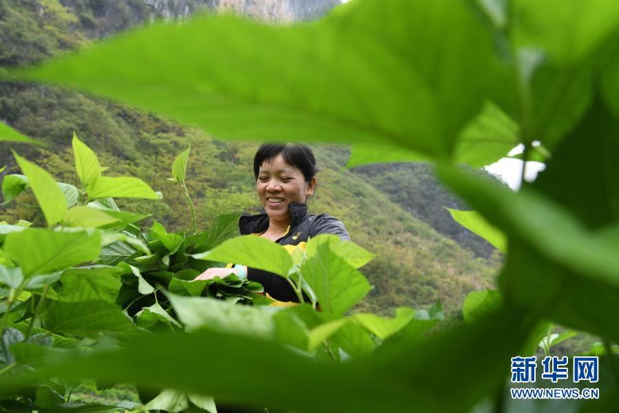 在廣西百色市凌雲縣下甲鎮加西村,當地村民在採摘桑葉(2019年3月27日攝)。新華社記者 陸波岸 攝