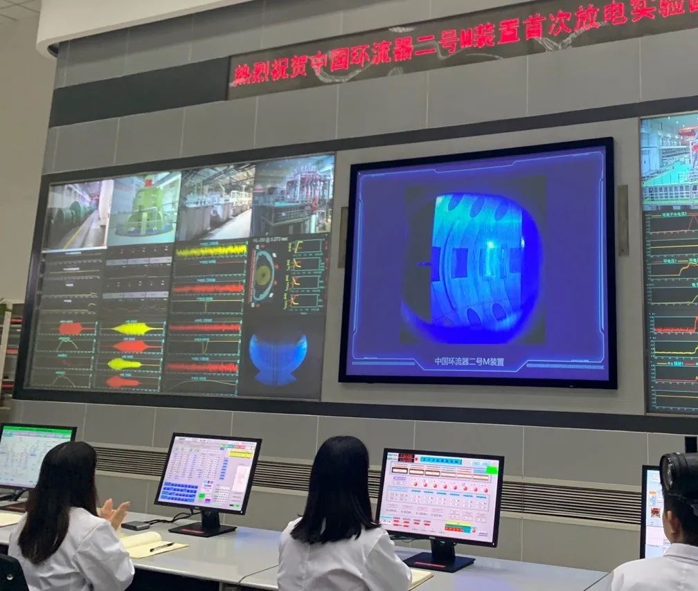 “1號電機、2號電機轉速1480轉每分鐘,系統準備就緒;4號電機轉速400轉每分鐘,系統準備就緒……中國環流器二號M裝置首次等離子體放電實驗開始!”12月4日14時02分,位於四川成都的中核集團核工業西南物理研究院內,中國環流器指揮控制中心大屏幕上的藍色電光閃爍。