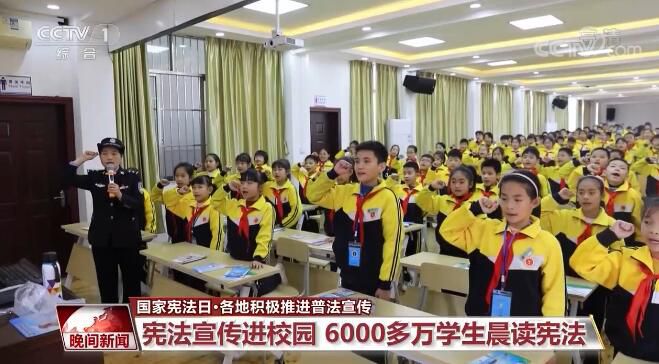 憲法宣傳走入各大中小學校園,12月4日,第七屆“國家憲法日”“憲法晨讀”活動舉行,6000多萬學生同步誦讀憲法,全國共25萬多所學校觀看了活動直播視頻。