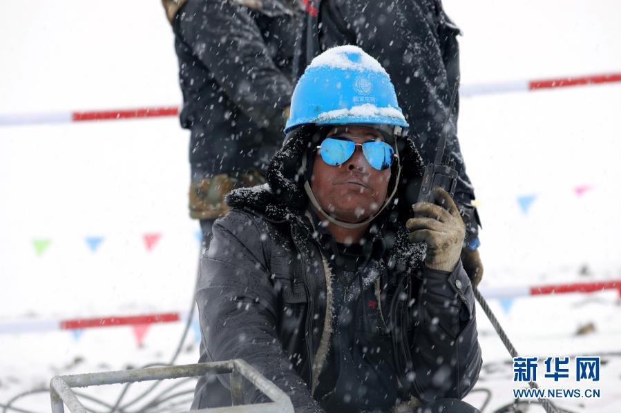 在西藏日喀則市定日縣,西藏阿里與藏中電網聯網工程線路4標段施工人員在暴風雪中作業(5月2日攝)。新華社發