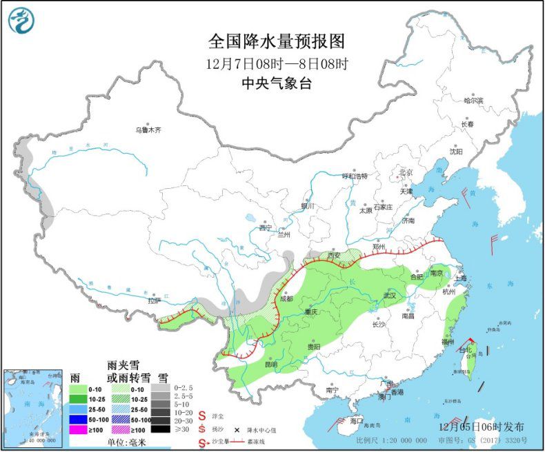 12月7日08時至8日08時,川西高原、四川南部、雲南西北部、陝西西南部等地部分地區有小雪或雨夾雪。江漢大部、江淮西部、江南北部和東部、四西南地區東部、台灣島等地部分地區有小雨。