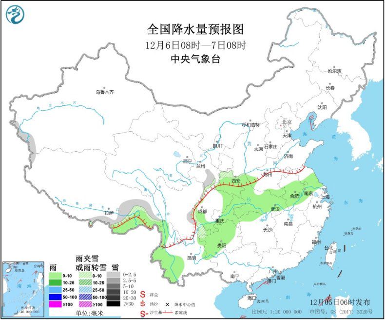 12月5日08時至6日08時,新疆西北部、青藏高原東南部、甘肅東南部、陝西北部、四川盆地西南部等地部分地區有小到中雪或雨夾雪,西藏東南部局地有大雪。陝西南部、四川盆地中東部、重慶大部、貴州北部和西部、雲南大部、台灣島大部等地有小雨。內蒙古中部、江南東部等地部分地區有4~5級風。