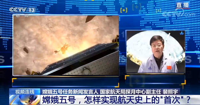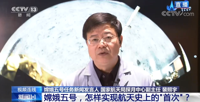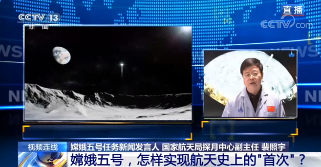 裴照宇: 上升器昨天實現月面起飛之後,進入到預定的軌道,到現在為止我們對它做的主要工作是進行兩次遠程導引控制,其目的是其於瞄準與軌道豈交會時的預定時間,目標位置和速度,這是兩次遠程導引,我們還需要進行兩次遠程導引才能達到剛才所説的預定時間,預定目標和預定速度,之後將轉入到由軌道器實施的自主控制階段,目前上升器與軌道器處在同一個平面內飛行,其軌道高度低於軌道器,處在軌道器的後下方,現在各設備均工作正常。