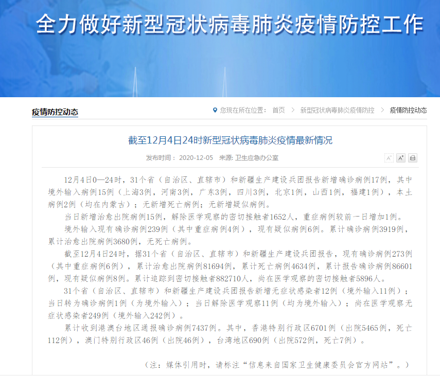 截至12月4日24時,據31個省(自治區、直轄市)和新疆生產建設兵團報告,現有確診病例273例(其中重症病例6例),累計治癒出院病例81694例,累計死亡病例4634例,累計報告確診病例86601例,現有疑似病例8例。累計追蹤到密切接觸者882710人,尚在醫學觀察的密切接觸者5896人。