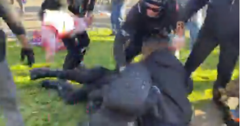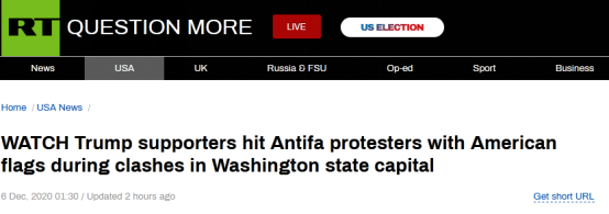 據報道,當天,聚集在華盛頓州國會外的支持特朗普的人士與參加Antifa活動的示威者發生了對峙。隨後暴力事件接踵而至,RT稱,傳至社交媒體上的視頻顯示:特朗普支持者用美國國旗毆打了Antifa活動人士。↓