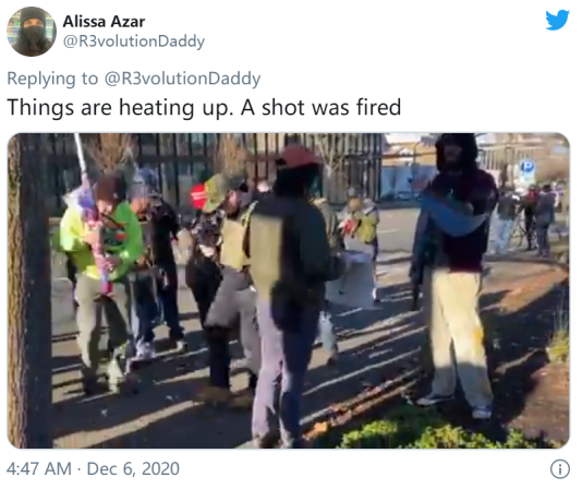 報道稱,警方隨後證實,他們逮捕了一名“可能用手槍向(Antifa)人羣至少發射了一發子彈”的人。他們補充説,隨着警方“監控以確保今後事態和平發展”,抗議人羣最終散開。